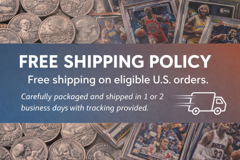 Welcome to E&M Coins & Sports Cards, your trusted online store for high-quality U.S. coins and sports cards. This website offers secure PayPal checkout with FREE shipping on all purchases. We also operate an external eBay store featuring over 250 items, where additional inventory is available; please note that shipping charges apply to eBay purchases. Our collection includes certified U.S. coins such as Morgan silver dollars and Franklin half dollars, along with graded and raw sports cards from the NBA, NFL, and NHL. All images are taken at high resolution to represent each item’s condition and grade accurately—we do not enhance or alter our photos, so what you see is exactly what you get. Every item is carefully selected, accurately described, and securely packaged to provide collectors and investors with authentic, high-quality collectibles.
