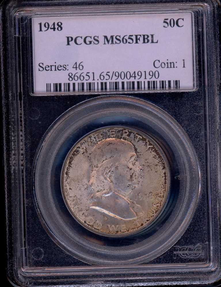 This listing is for a 1948-D Franklin Half Dollar, graded MS63 FBL (Full Bell Lines) by Professional Coin Grading Service (PCGS).