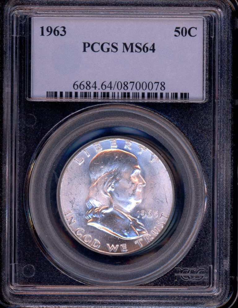 This listing is for a 1963-D Franklin Half Dollar, graded MS64 by Professional Coin Grading Service (PCGS).